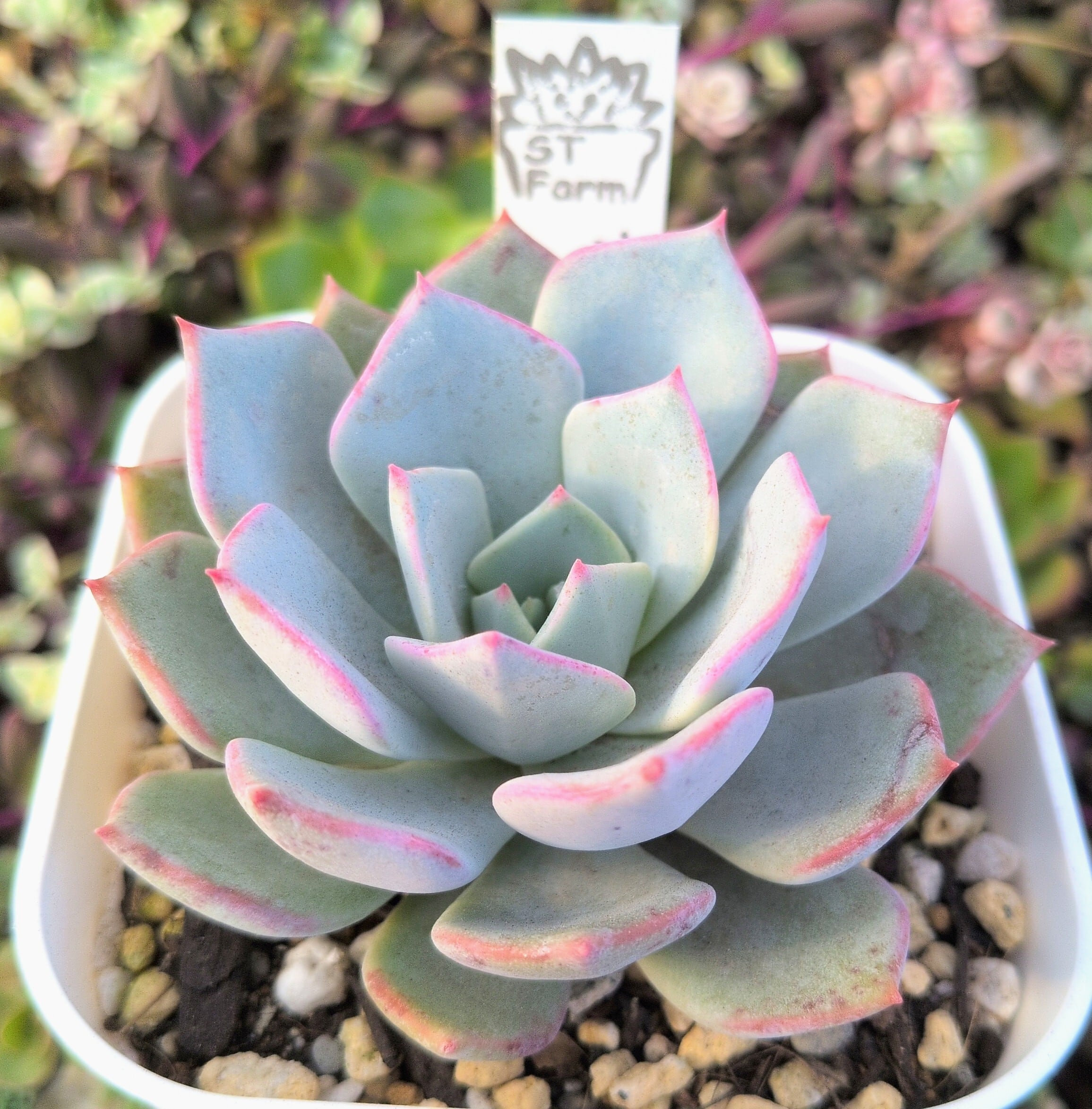 剣先のような葉に赤いエッジをもつストリクチフローラ ノヴァと、ぷっくりした葉に白粉が美しいラウイを交配したら、先端に赤いポッチのある白粉系のエケベリアになりました。