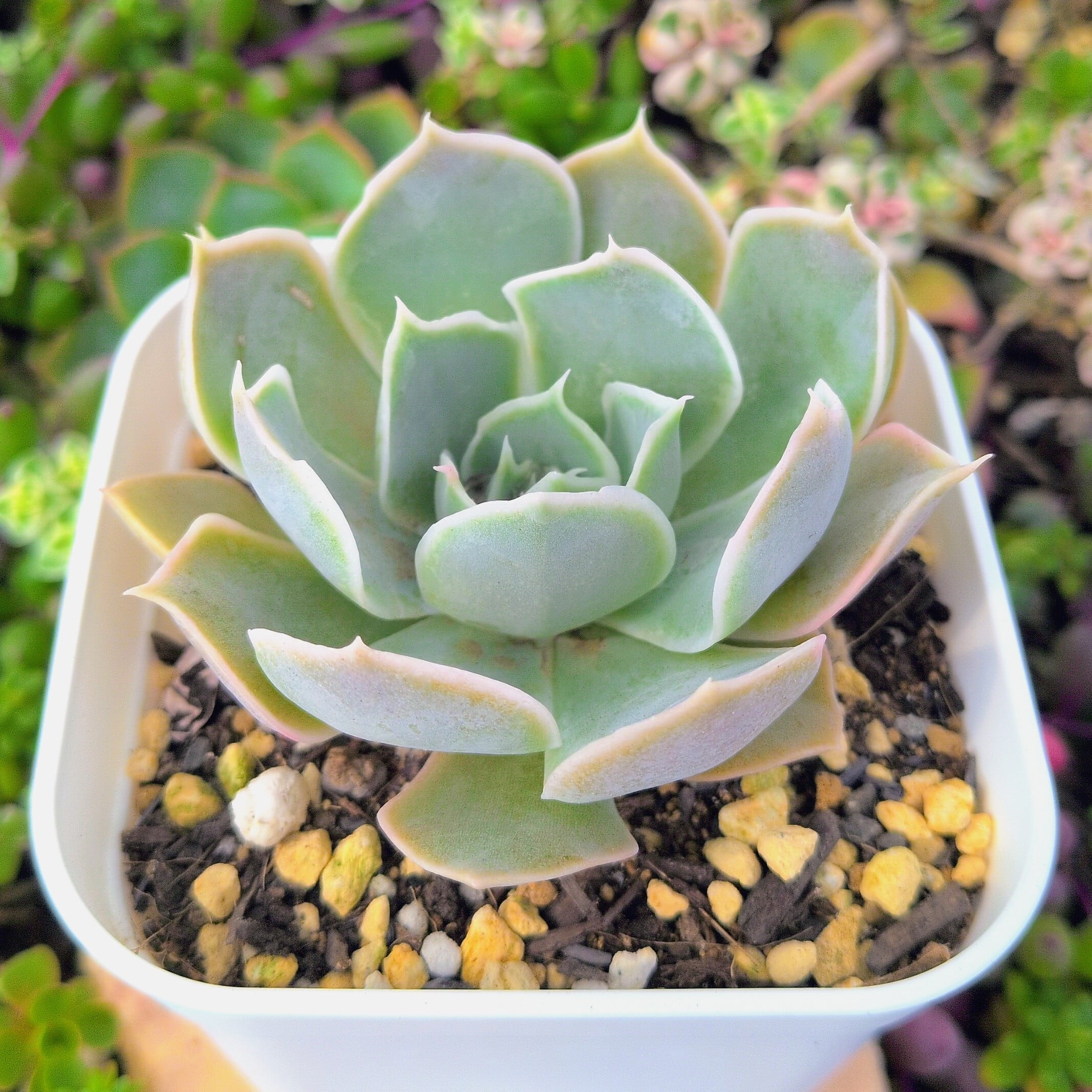 ヒラヒラの葉が可愛いシムランスと、ややカールした葉がエレガントなリラシナを交配したら、葉が大きくウェーブするエレガントで可愛いエケベリアになりました。