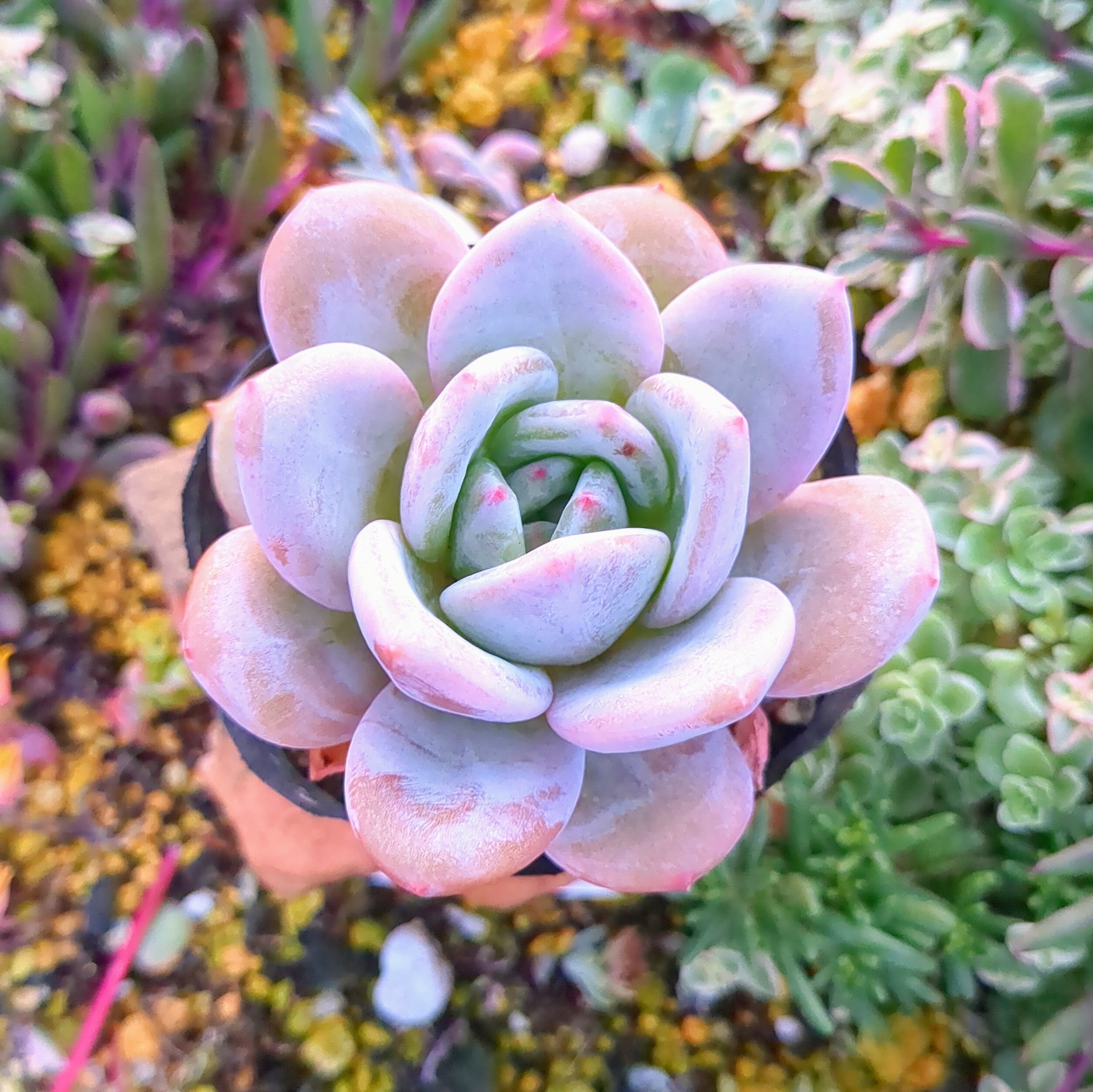 ラウイとアガボイデス ロメオの交配種と言われています。葉にウォーターマークが現れて、うっすらと粉をまといます。季節により葉の色がライトグリーンからピンクへと変化するかわいい品種です。