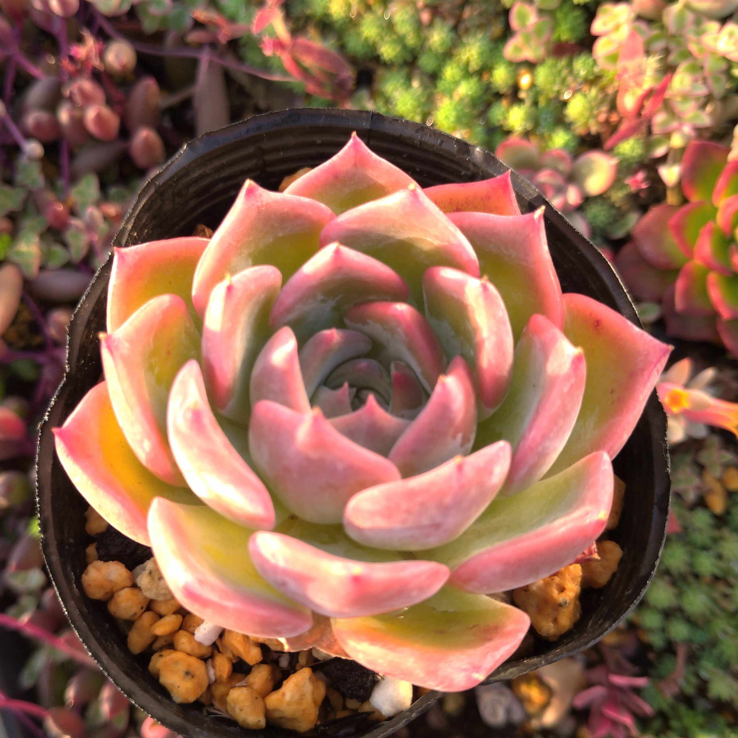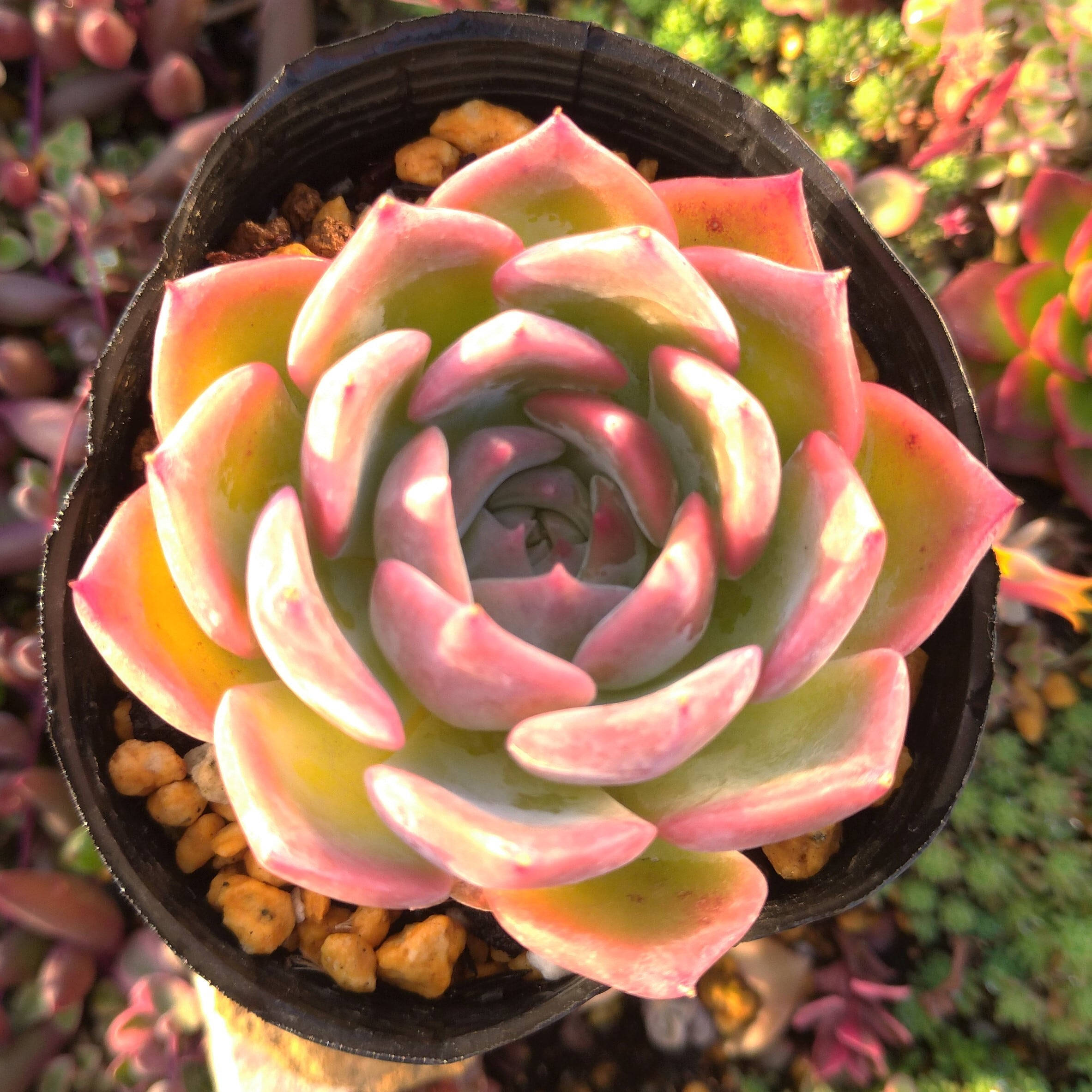夏でもピンクに色づき、赤みが残り夏顔になりにくいです。紅葉時は赤みが強くなり、水を切るとぎゅっと丸くなります。葉にほんのりと粉をまとって、とても可愛らしい姿になります。