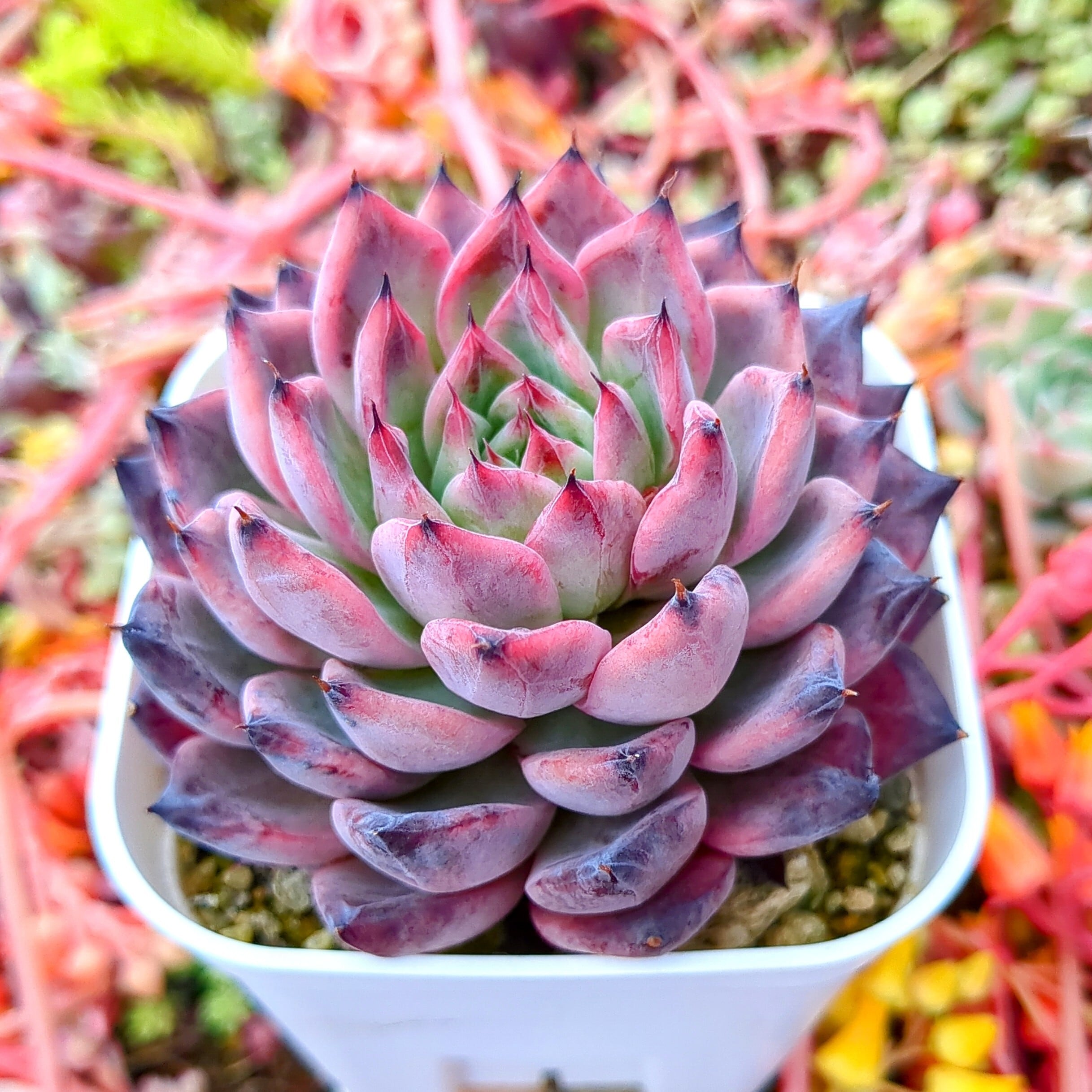 夏でも赤さを保ち、緑一色になりがちな多肉棚や寄せ植えを彩ってくれます。少し粉をまといます。