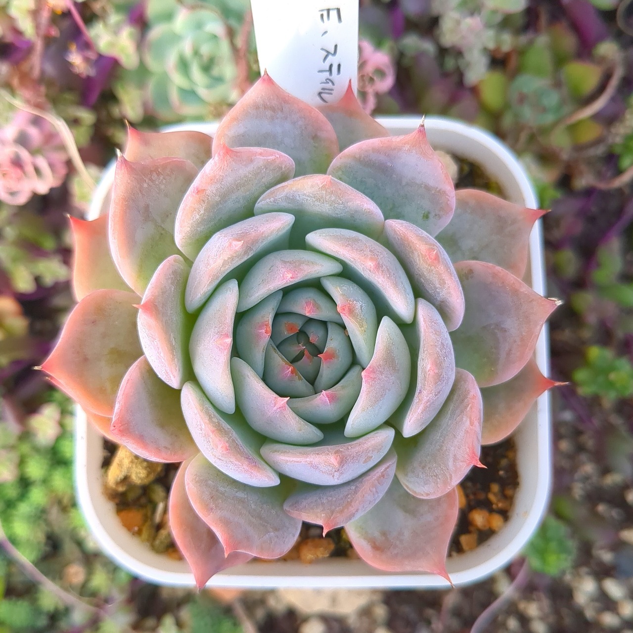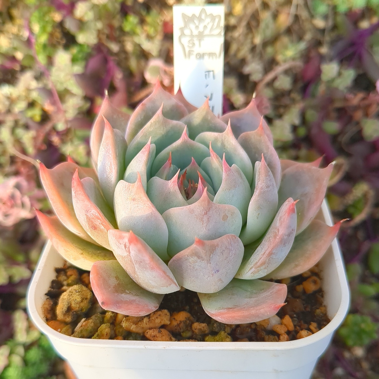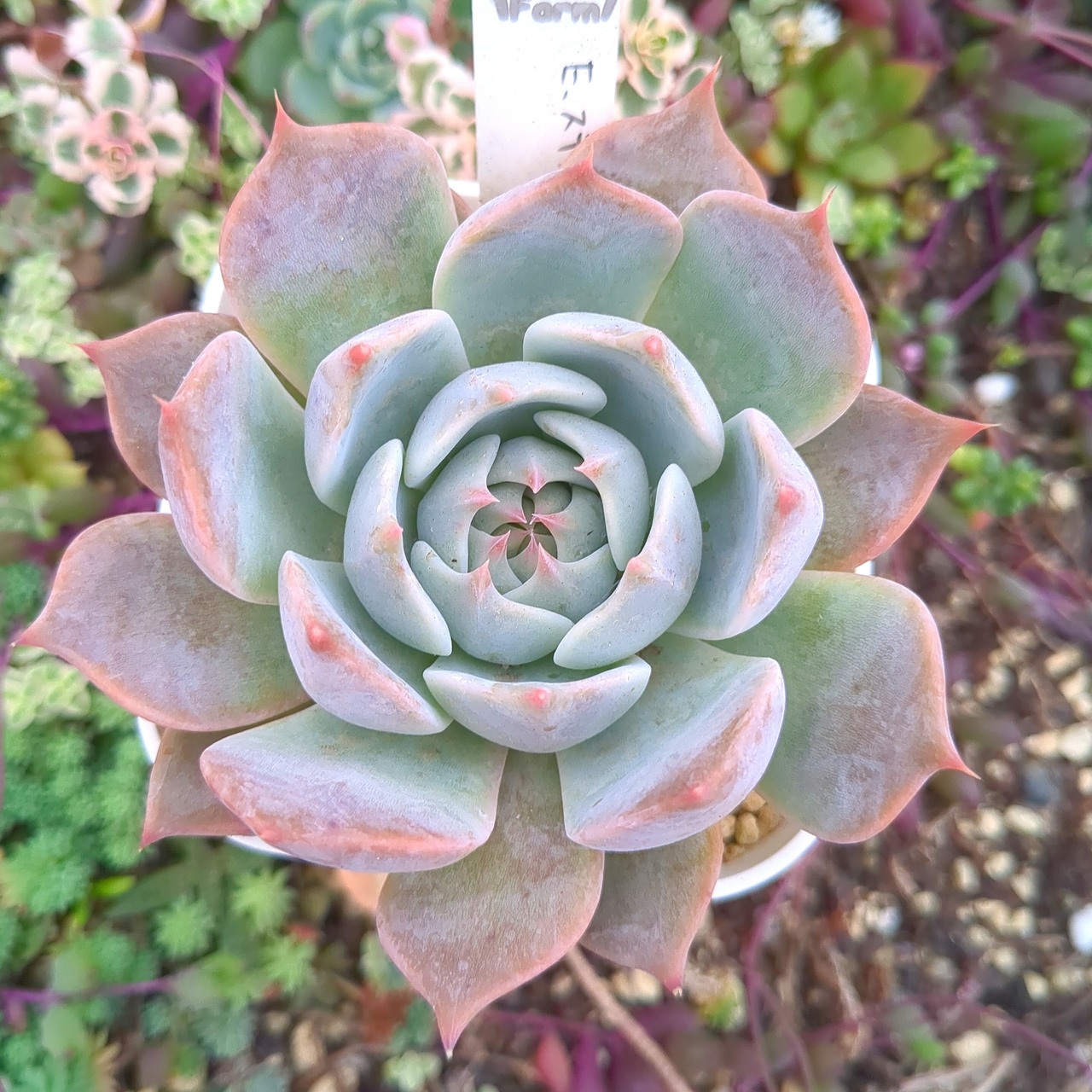 全体がピンクがかっており、中心部がほんのり青みがかったグリーンで冬になるにつれロゼットが締まってきます。